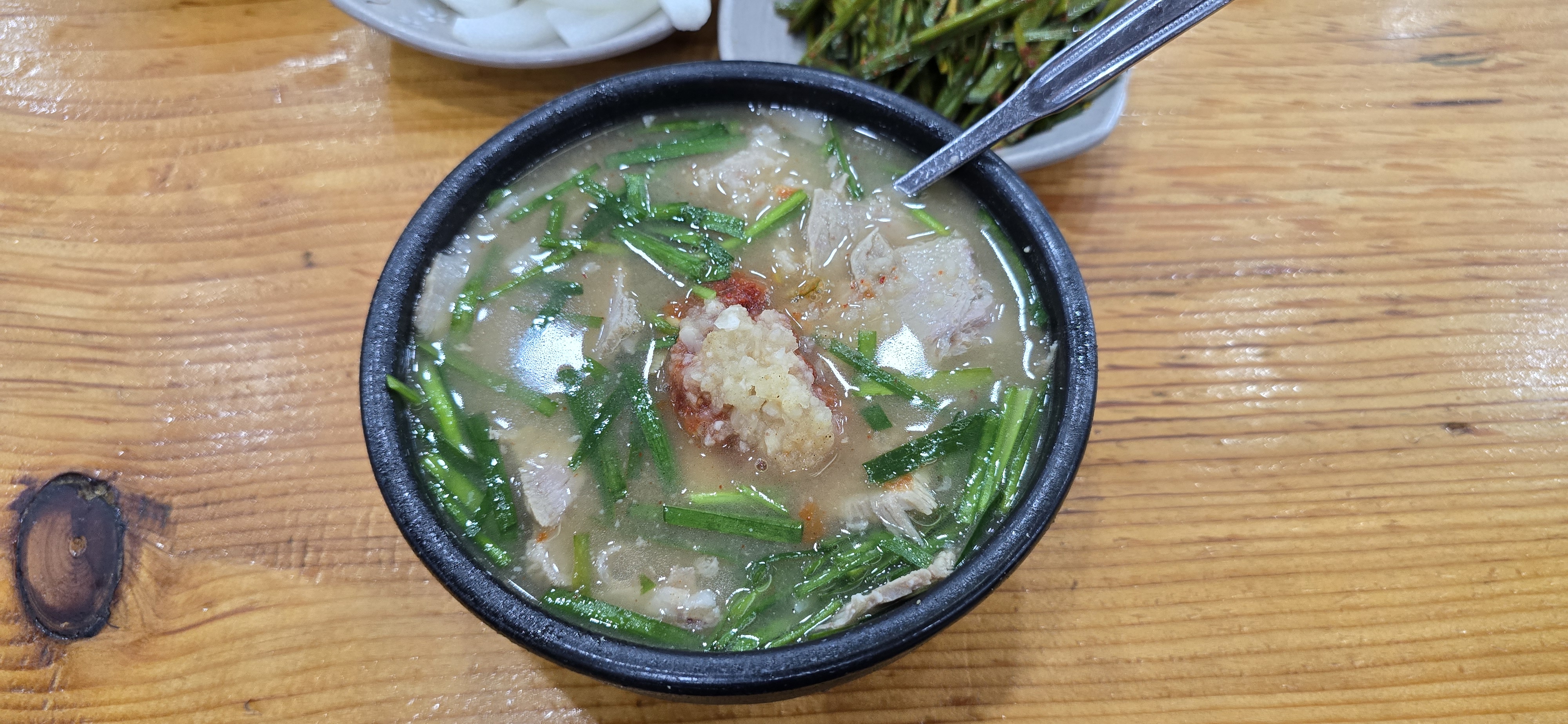 고기국밥은 일반적인 돼지국밥보다 훨씬 깔끔하고 담백한 국물 맛이 특징입니다. 국물 위에는 다진 양념과 함께 다진 마늘이 올려져 나오며, 이 마늘이 국물과 어우러져 깊은 풍미를 더해줍니다. 잡내 없이 부드러운 고기와 알싸한 마늘 향이 잘 어울렸습니다.